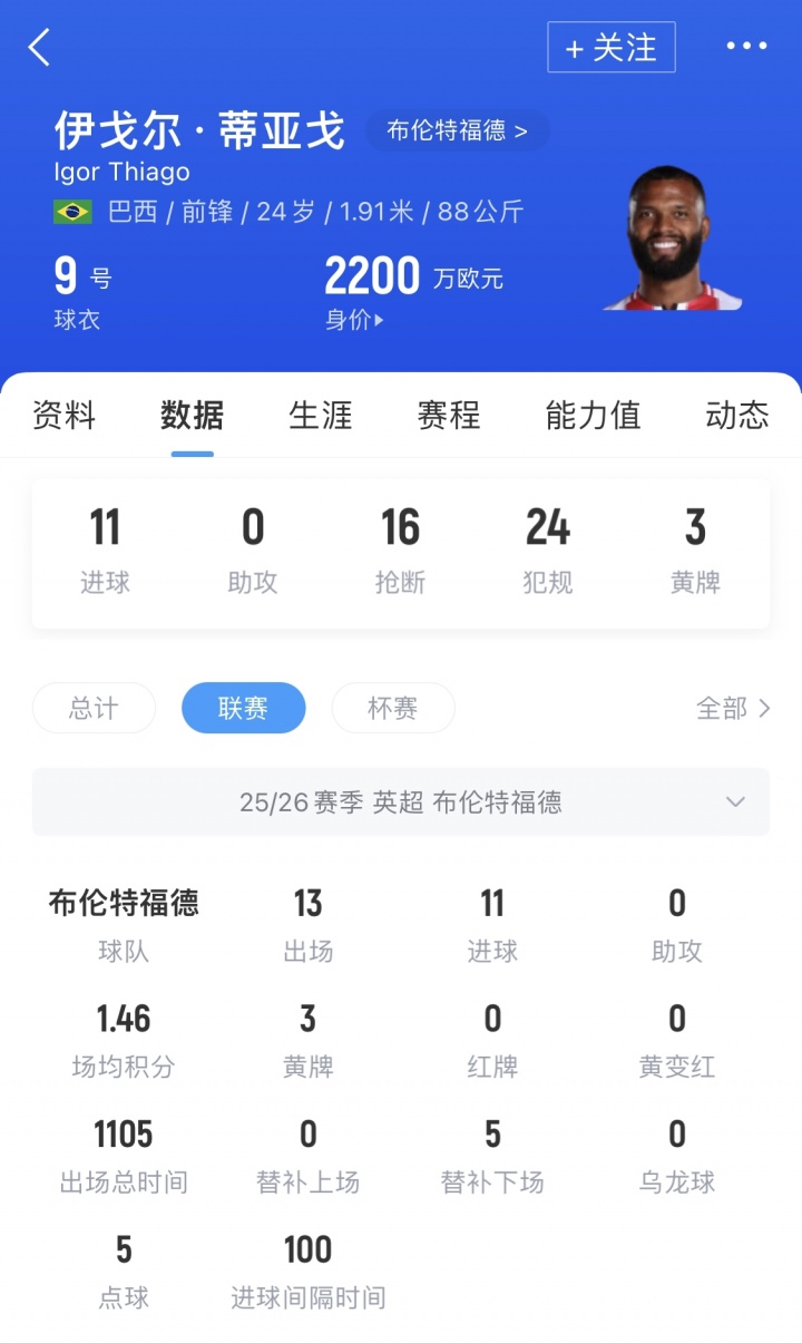 11月30日讯 英超第13轮,布伦特福德主场3-1击败伯恩利,伊戈尔·蒂亚戈梅开二度,本赛季英超13轮11球,在射手榜上仅次于哈兰德(14球),各项赛事14场12球进账。