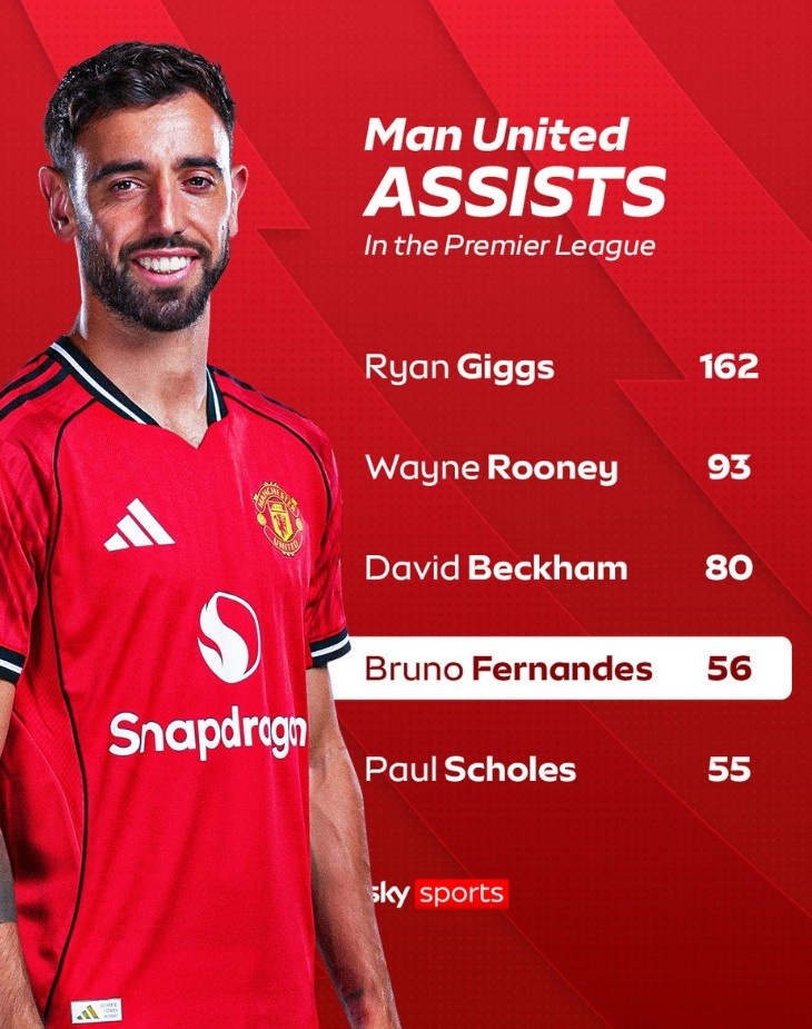 B费曼联生涯英超助攻数已经达到56次,超越名宿斯科尔斯,以下为曼联队史英超助攻榜: