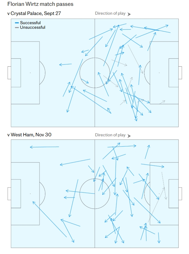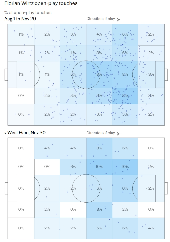 而在伦敦碗,利物浦阵型明显改善,维尔茨与中场队友的互动初现化学反应。不可否认的是,西汉姆给予了维尔茨从容接球的空间,但他确实展现出了更充足的信心和效率,本应收获一球一助攻。