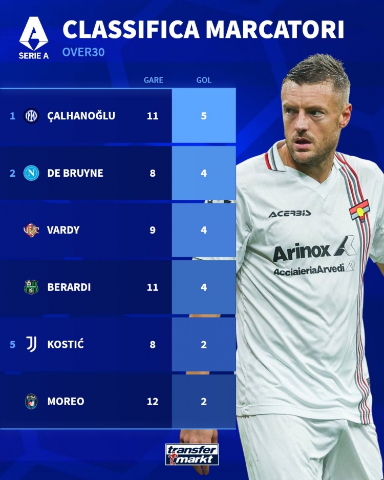 12月2日讯 德国转会市场统计了本赛季年龄30+球员在意甲的进球数量,并列出榜单,恰尔汗奥卢5球居首,德布劳内、瓦尔迪、贝拉尔迪4球。
