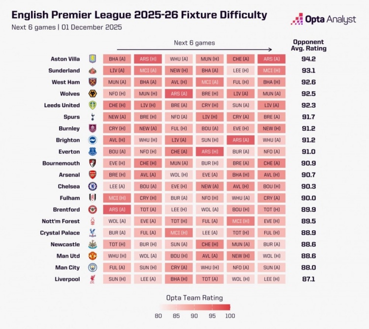 12月2日讯 opta分析了英超各队未来6轮的赛程难易程度,维拉赛程最为艰难,利物浦最容易。曼城第二容易,曼联并列第三容易。