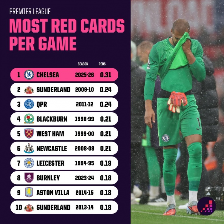 12月2日讯 Opta统计了英超球队各赛季的场均红牌数量,并列出英超历史单赛季场均红牌数量排名,本赛季切尔西0.31张居首。