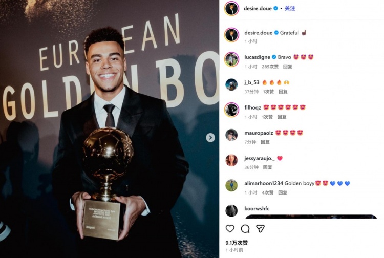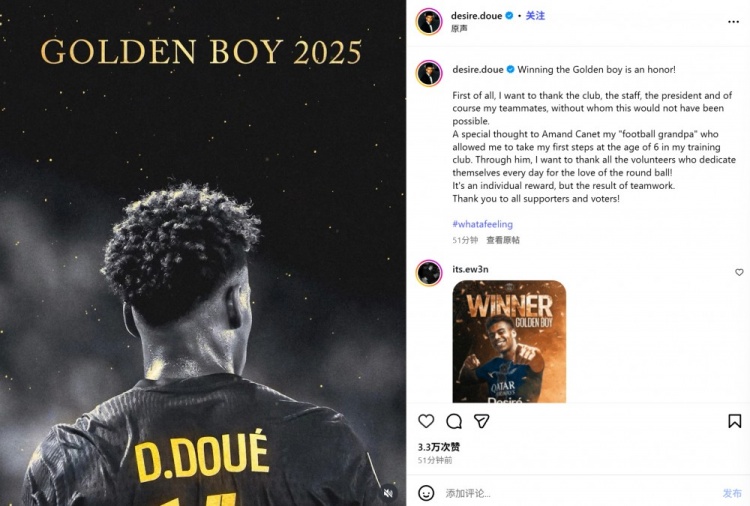 杜埃社媒纪念赢得金童奖:感谢巴黎俱乐部上下以及我的启蒙教练