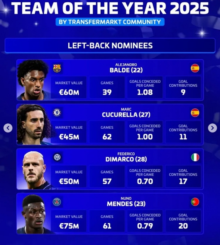 12月3日讯 《转会市场》评选2025年最佳左后卫,并列出了4人候选同时对比了他们的数据: