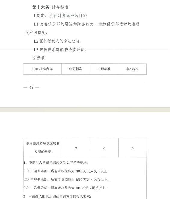 12月03日讯 中足联印发就三级联赛准入规程财务标准:中超俱乐部所有者权益应为3000万人民币以上,中甲1500万人民币以上,中乙300万人民币以上。