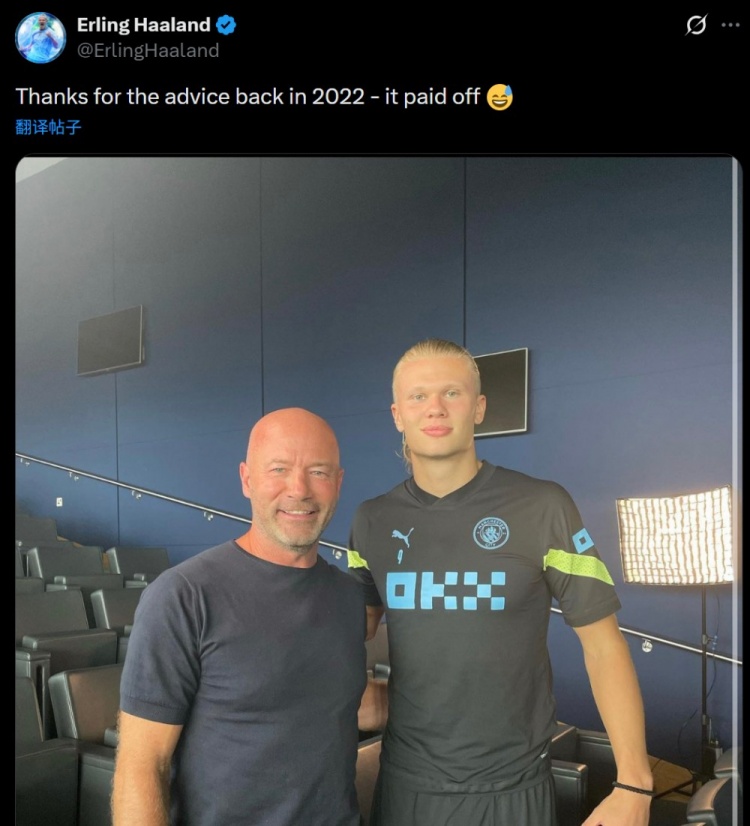 他也在本场比赛开场不久便取得进球,从而打破阿兰·希勒的纪录,解锁了英超历史最快100球纪录。哈兰德也在今日通过社媒晒出自己在刚加盟曼城时同希勒的合影,并配文:“感谢3年前的建议,它很管用