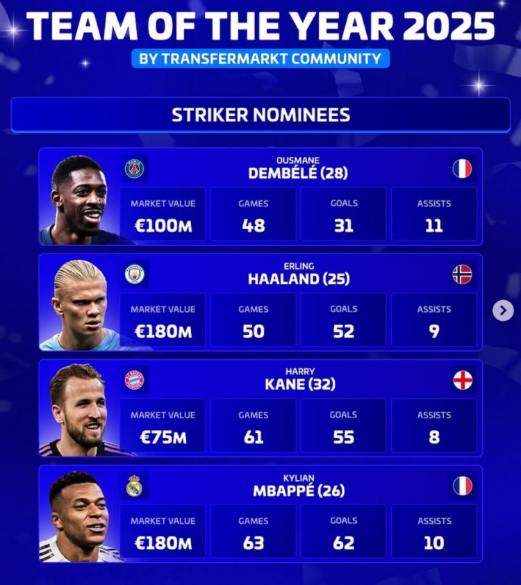 德转评2025年度最佳中锋名单:登贝莱、哈兰德、凯恩、姆巴佩