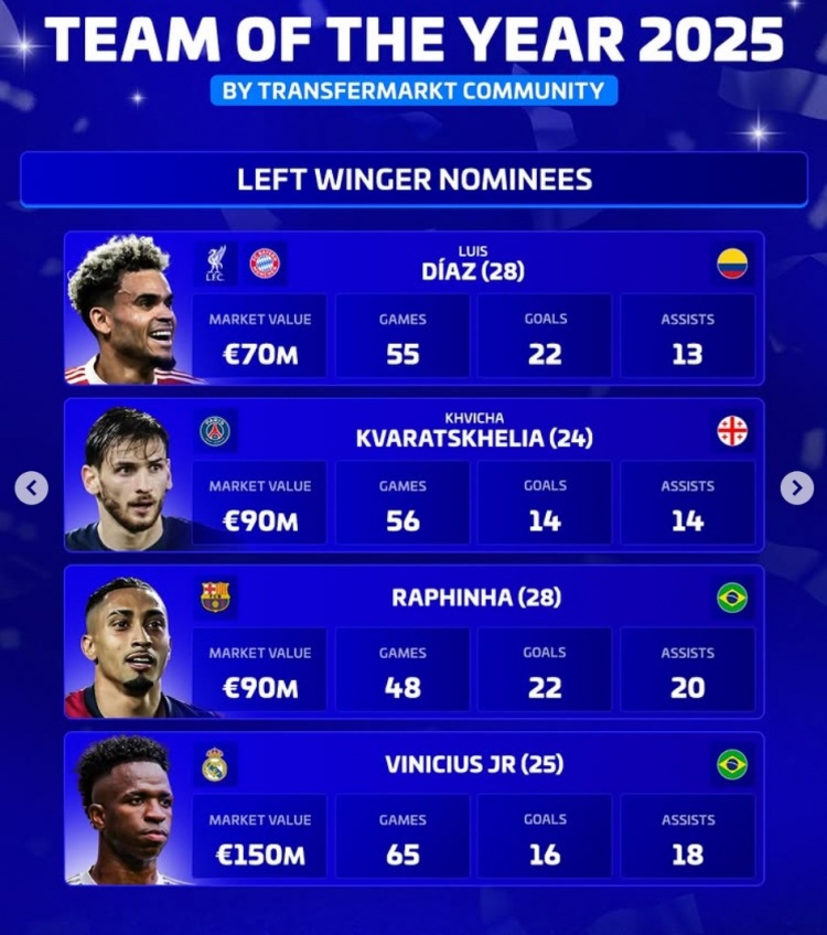 12月5日讯 《转会市场》评选2025年最佳左边锋,并列出了4人候选同时对比了他们的数据:
