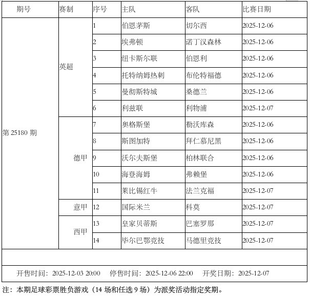 本周末派奖继续,传足胜负彩和任选9场第25180期游戏分别派奖600万元,提醒有兴趣的购彩者理性参与。本期竞猜场次中,曼城将在主场迎战黑马桑德兰,表现依旧坎坷的利物浦客场对阵利兹联。德甲领头羊拜仁和西甲领头羊巴萨也将奔赴客场作战,对手分别是斯图加特和皇家贝蒂斯。