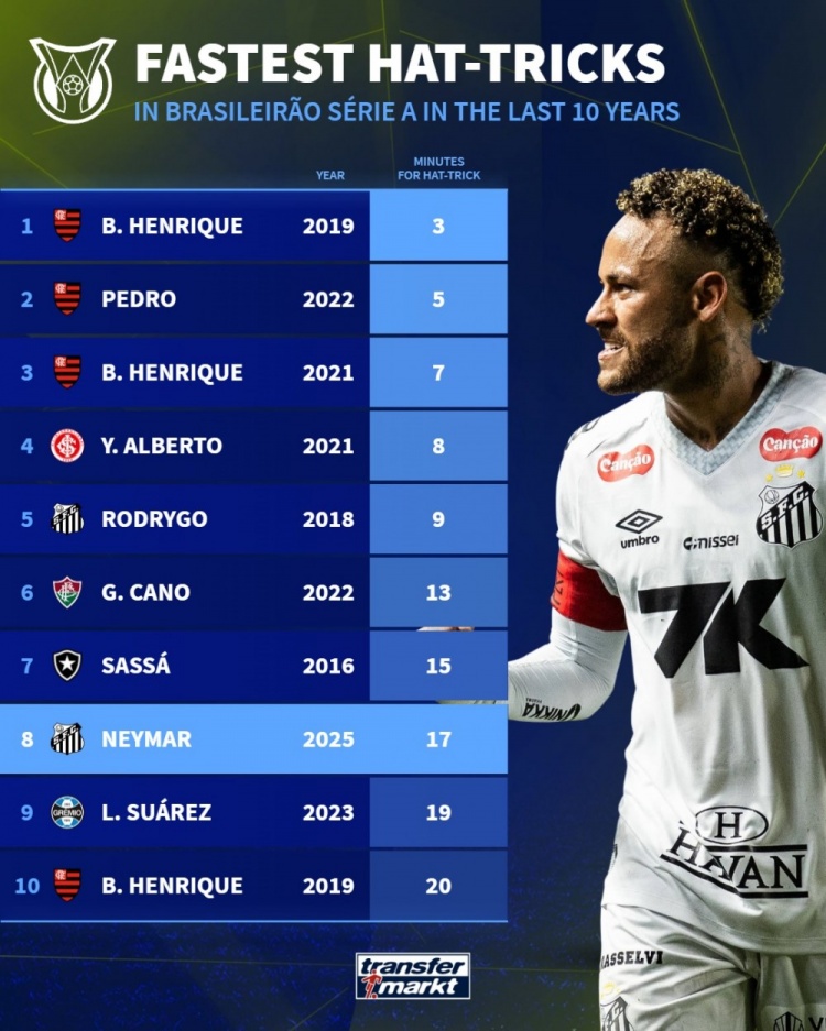 12月5日讯 巴甲第37轮比赛,内马尔戴帽,帮助桑托斯3-0击败尤文图德。德国转会市场列出了巴甲近10年最快帽子戏法榜单,内马尔17分钟戴帽排名第8位。