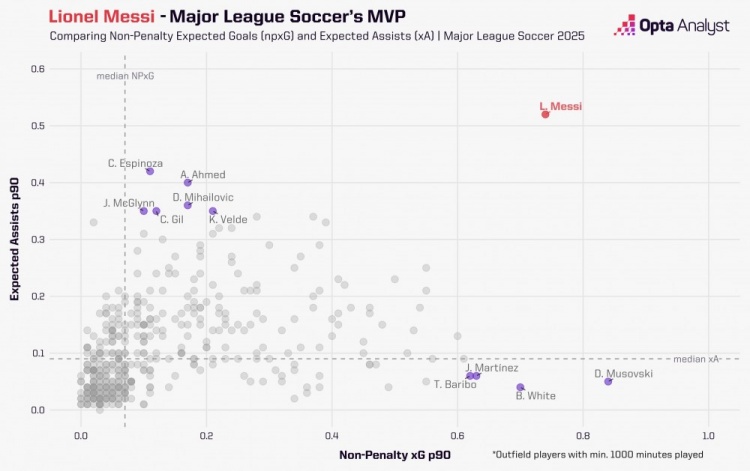 统计显示,梅西在2025赛季美职联的场均预期助攻数超过0.5球,排名第一,远超其他出场至少1000分钟的非门将球员。