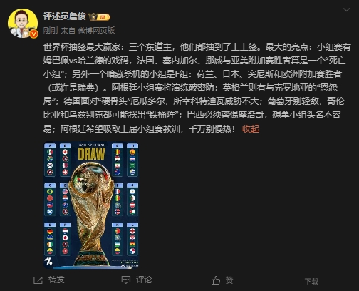 12月06日讯 2026年世界杯小组赛抽签已经结束,评述员詹俊在微博点评道: