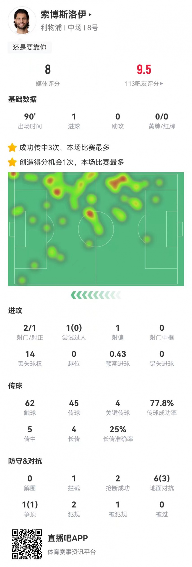 12月7日讯 利物浦在本轮英超3-3战平利兹联,索博斯洛伊本场数据如下: