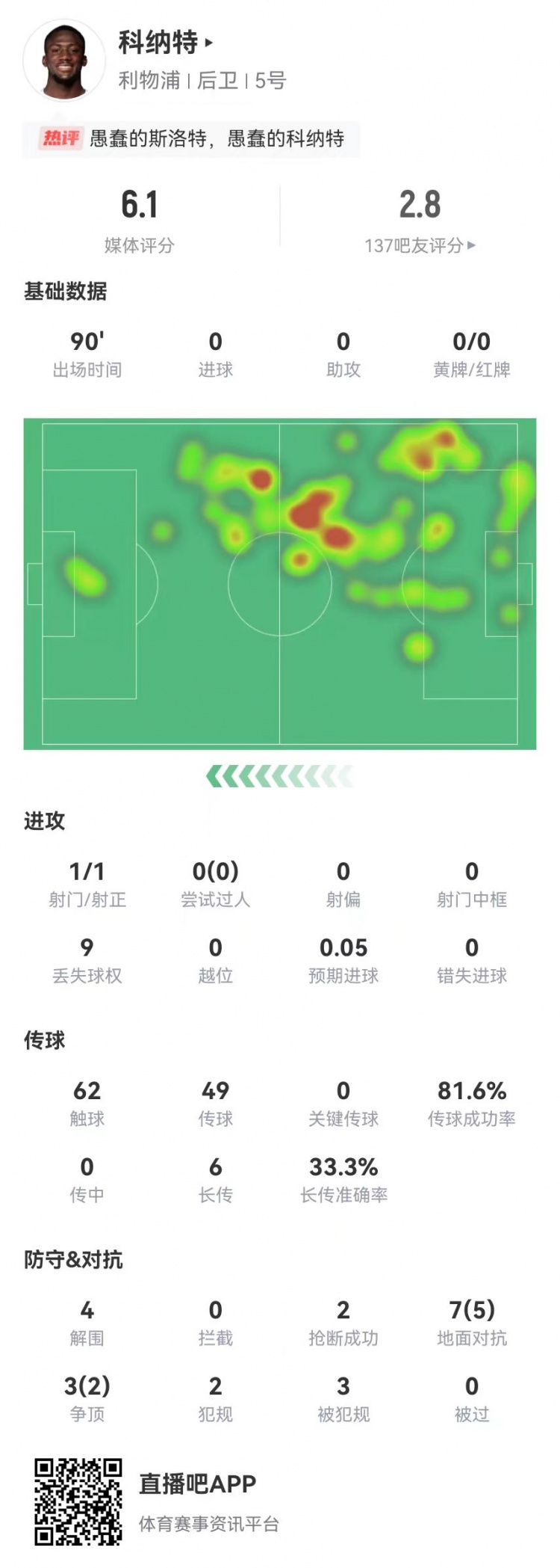12月7日讯 利物浦在本轮英超3-3战平利兹联,科纳特本场数据如下: