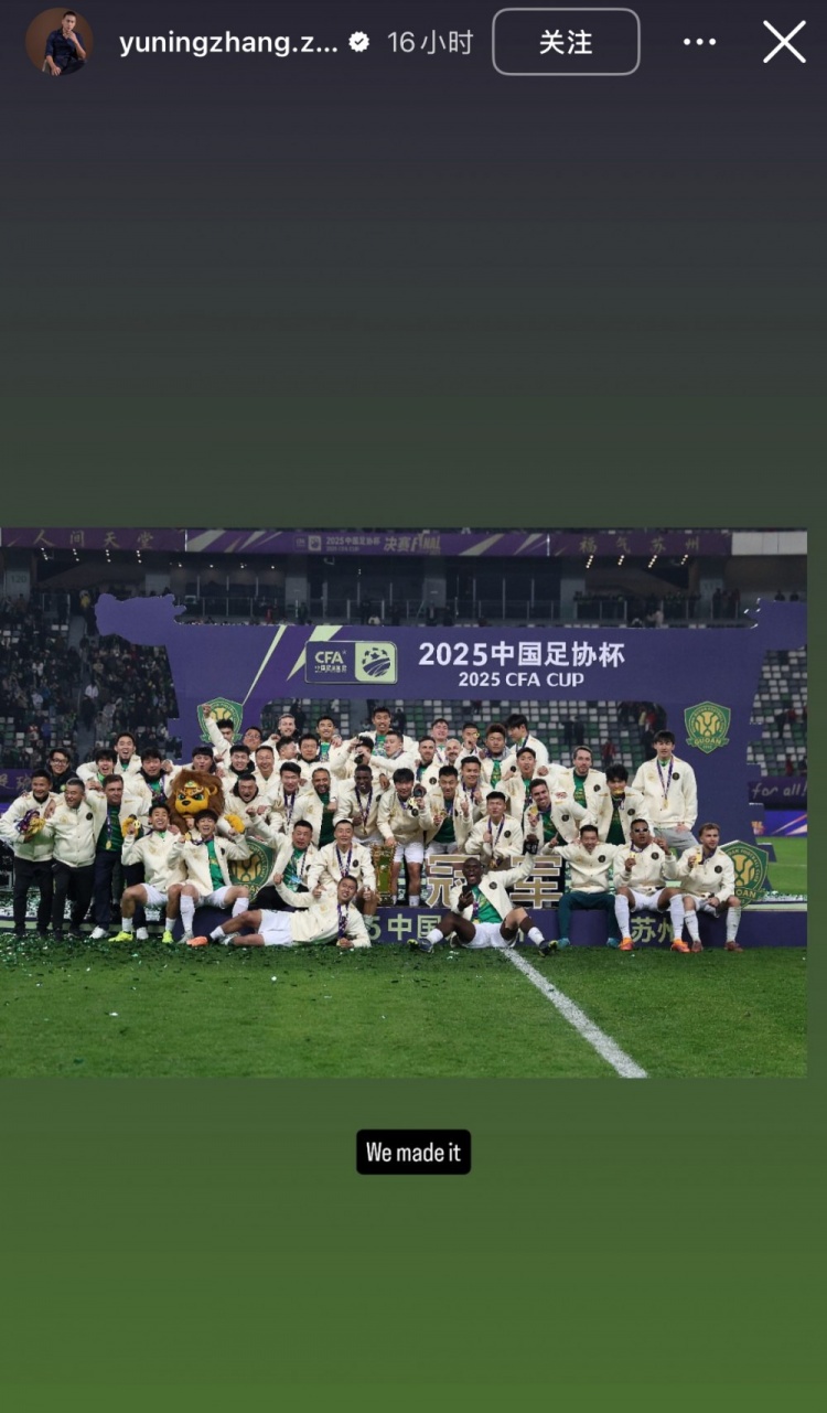 赛后国安前锋张玉宁在个人ins上发出多张赛后全队拍夺冠大合影的动态,并配文写道:“朋友们,我们是冠军!”“我们做到了!”