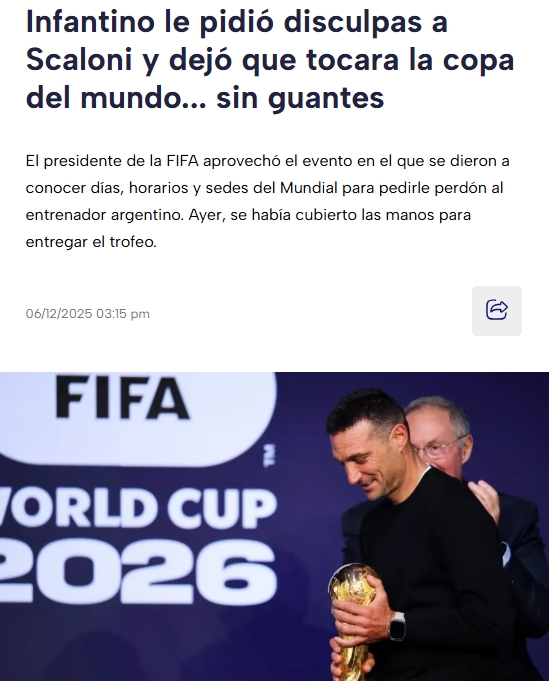 因凡蒂诺之所以致歉,是因为昨天的世界杯抽签仪式上,斯卡洛尼在归还世界杯奖杯大力神杯时戴着手套。