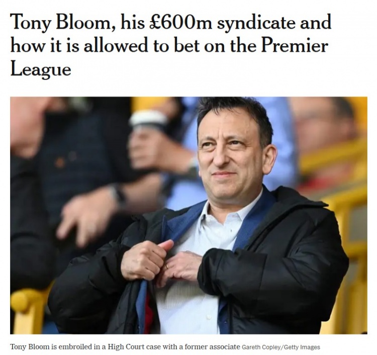 本周,一桩涉及布莱顿老板托尼·布鲁姆的法庭案件引发了关于其商业行为的讨论。布鲁姆的前合作伙伴瑞安·达德菲尔德(Ryan Dudfield)在伦敦高等法院提起诉讼,声称自己被欠1750万美元(约合1320万英镑),这笔钱来自一个使用“知名球员、体育明星和商人”账户进行投注的赌博集团。根据高等法院文件中的陈述,达德菲尔德承认自己“不知道集团成员的身份”,但他声称布鲁姆是集团的“头目”。布鲁姆被指是“唯一受益的所有者”,集团的赢利会存入他的银行账户并从中分配。