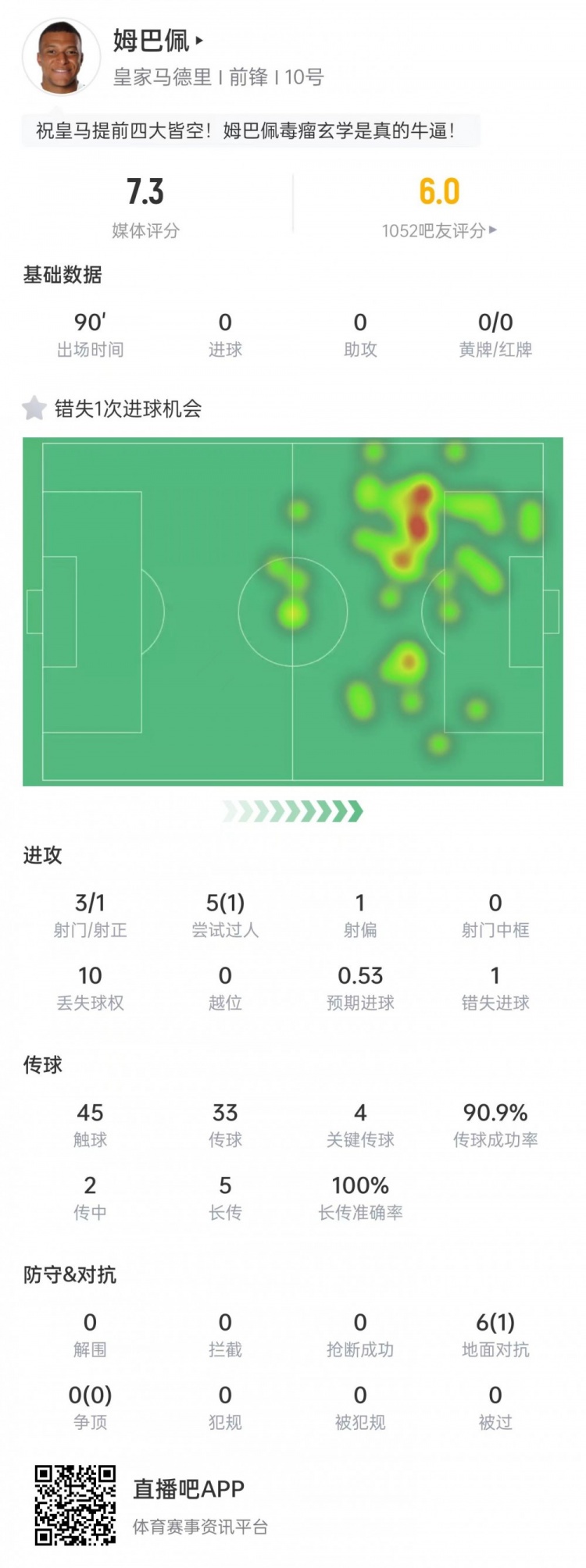 姆巴佩本场比赛数据:
