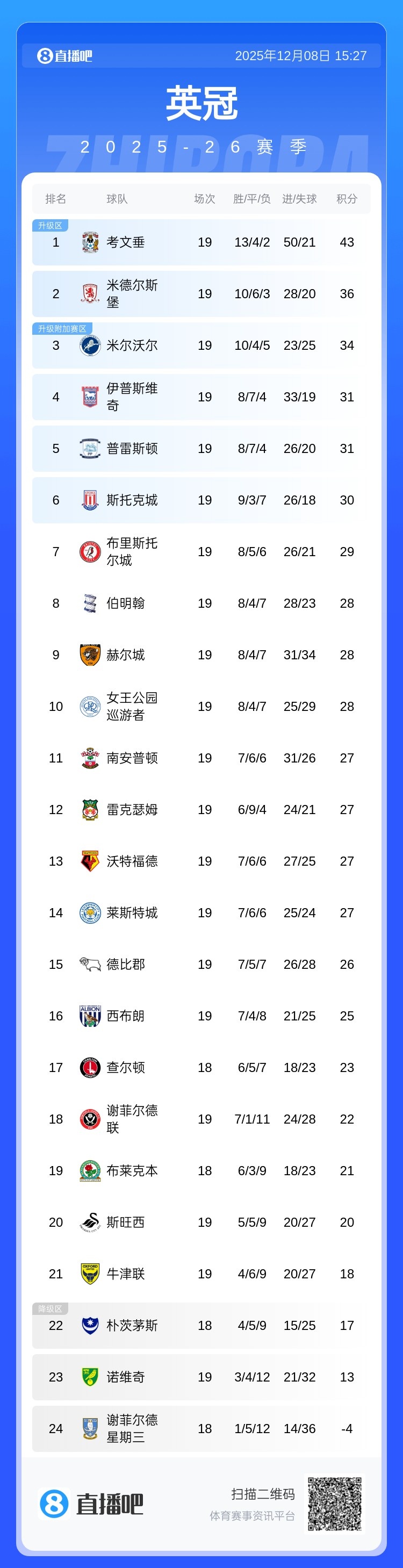 12月8日讯 上周末,考文垂在英冠客场0-3不敌伊普斯维奇,五连胜势头遭到中断,如今他们仍以7分优势领跑积分榜。