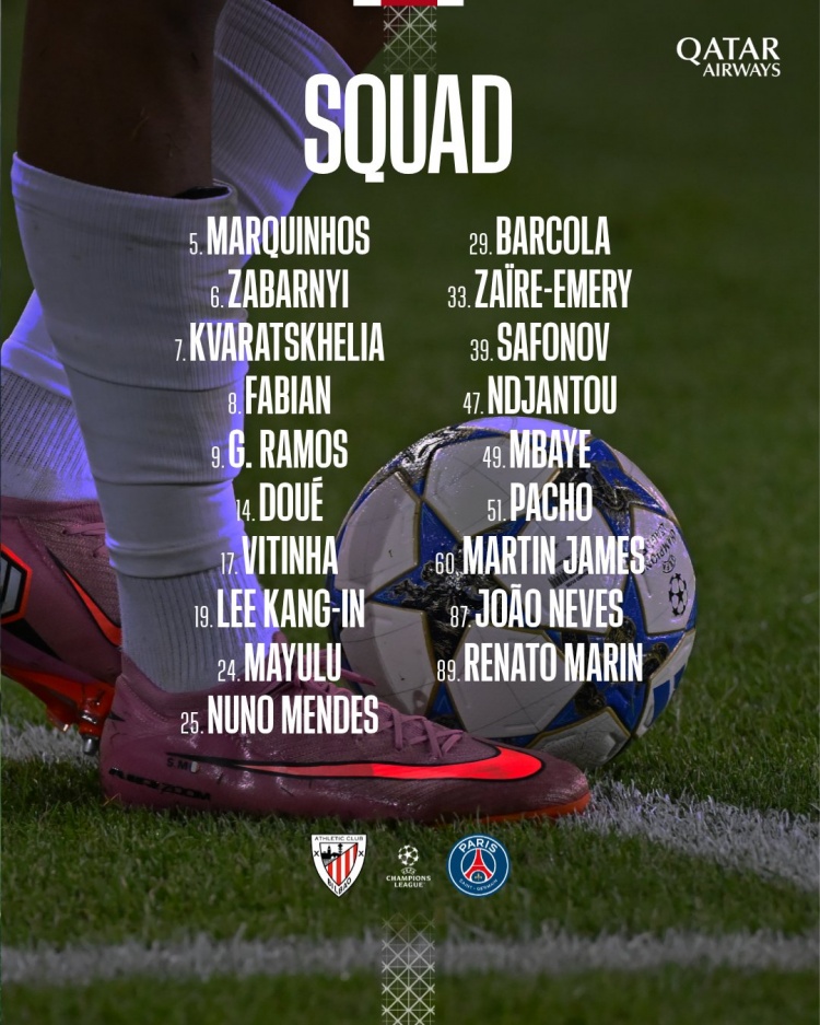 12月9日讯 北京时间12月11日凌晨,巴黎将在欧冠联赛阶段第6轮比赛中客场对阵毕尔巴鄂竞技,巴黎公布了此役的球员名单。登贝莱、舍瓦利耶、阿什拉夫、贝拉尔多、卢卡斯缺席,杜埃、努诺·门德斯回归。
