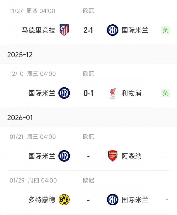 本赛季欧冠,国米的赛程先甜后苦,前面4轮对阵弱旅蓝黑取得全胜。然而后4轮全是豪门劲旅,国米已经输掉了2场:1-2马竞,0-1利物浦。接下来的两场,国米将迎战阿森纳,以及客场挑战多特蒙德。