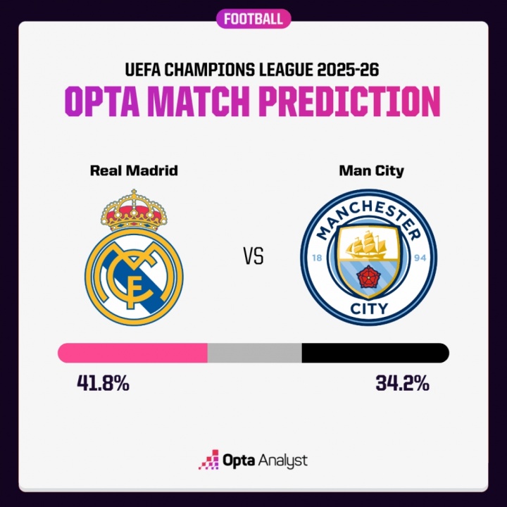 12月10日讯 北京时间12月11日凌晨4点,欧冠联赛阶段第6轮皇马将在主场大战曼城,赛前数据机构Opta略微看好皇马取胜。