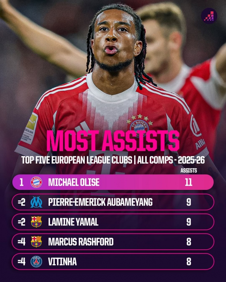 12月10日讯 拜仁边锋奥利塞本赛季的状态持续火热。据Opta数据统计,在欧洲五大联赛各项赛事的助攻中,奥利塞以11次助攻位列榜首。