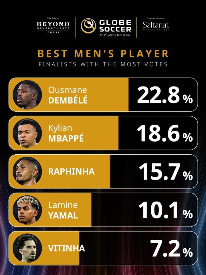 12月11日讯 环球足球奖公布了2025年最佳男足球员的投票情况,登贝莱22.8%领跑,姆巴佩18.6%次席。