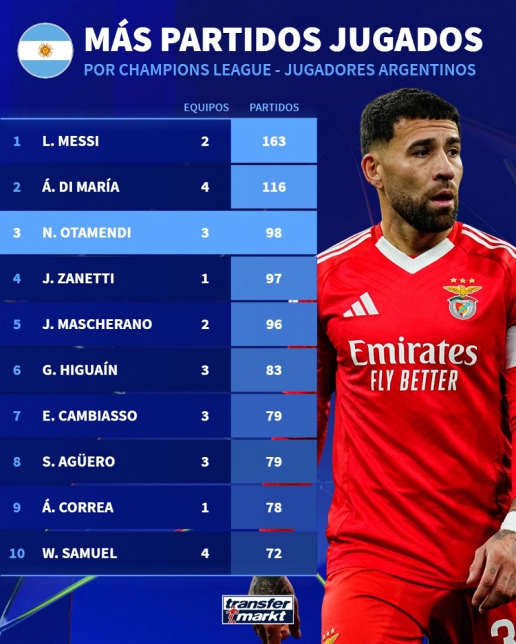 12月12日讯 德国转会市场统计了阿根廷球员的欧冠出场次数,并列出榜单,梅西、迪马利亚前两名,奥塔门迪升至第三位。
