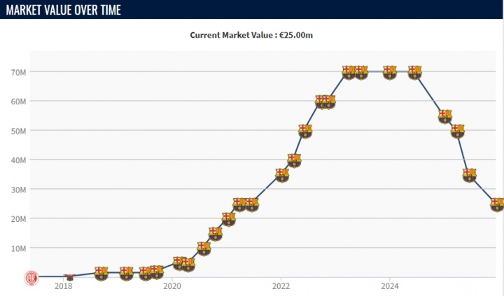 阿劳霍巅峰身价为2023-2024年的7000万欧,自2024年夏天以来,他的身价已经遭遇了4连跌。