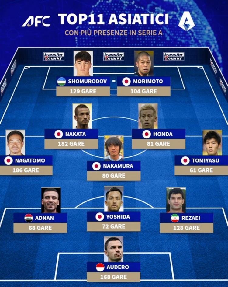 中场:富安健洋(61场,日本)、中村俊辅(80场,日本)、长友佑都(186场,日本)、本田圭佑(81场,日本)、中田英寿(182场,日本)