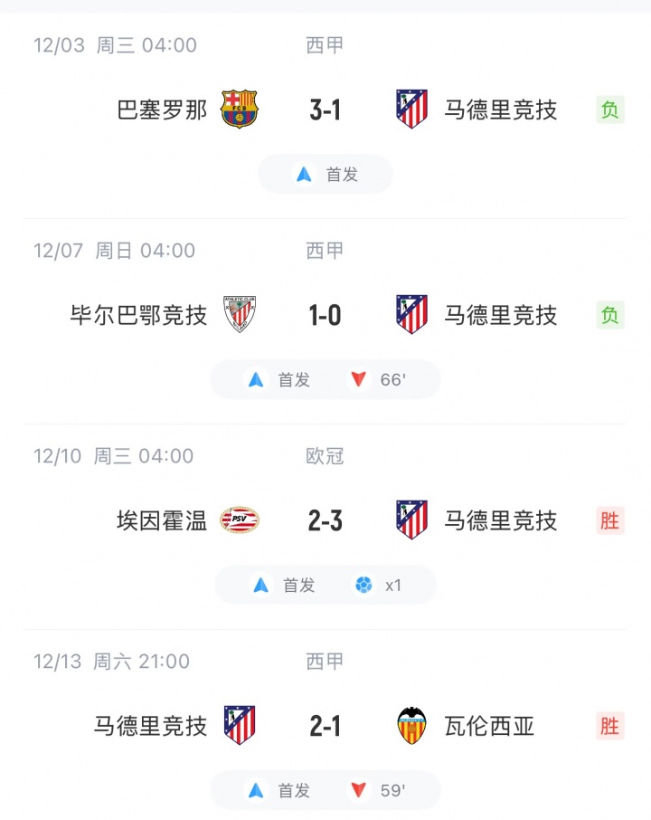 12月13日讯 西甲第16轮,马竞2-1瓦伦西亚,本场过后,小蜘蛛阿尔瓦雷斯连续六轮西甲未破门,本场第60分钟被格列兹曼换下。