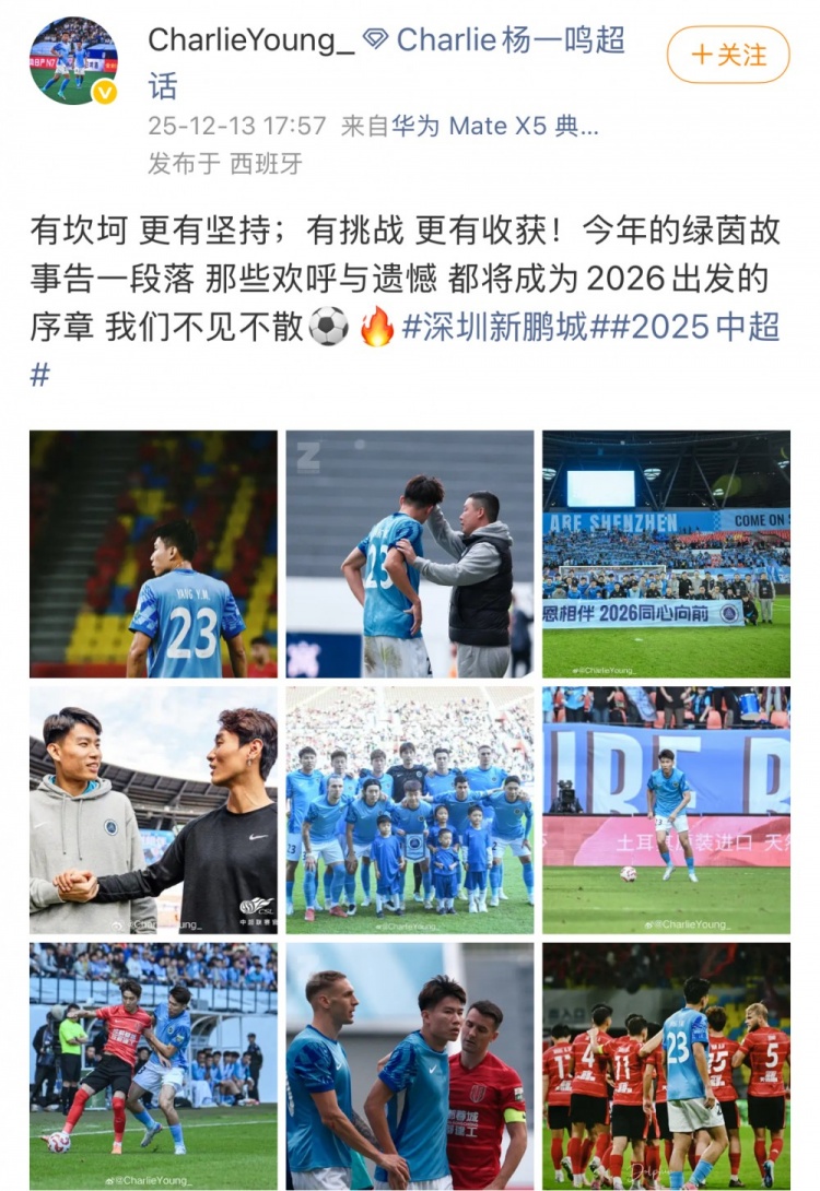 杨一鸣在社媒写道:“有坎坷,更有坚持;有挑战,更有收获!今年的绿茵故事告一段落,那些欢呼与遗憾,都将成为2026出发的序章。我们不见不散!”