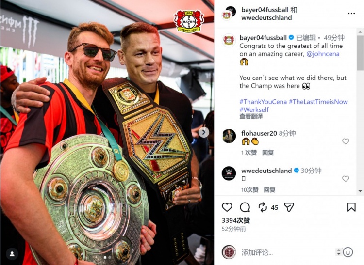 WWE巨星约翰·塞纳退役,勒沃库森官方晒照致敬