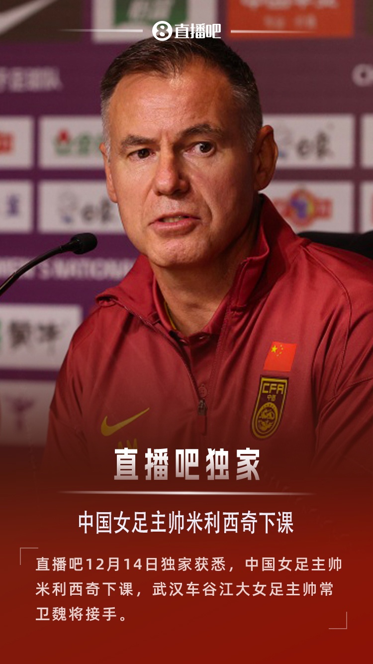 直播吧独家:中国女足主帅米利西奇下课,武汉女足主帅常卫魏接手