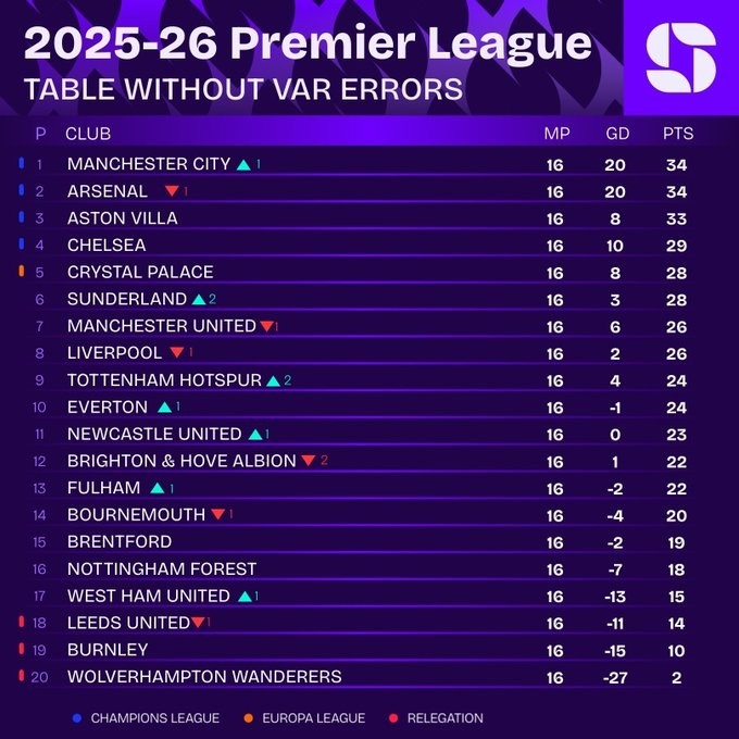 12月17日讯 Squawka统计去除VAR判罚错误后的英超积分榜情况,曼城、阿森纳排名前二。
