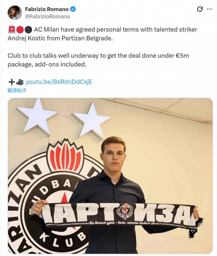 罗马诺指出,米兰有意引进贝尔格莱德游击18岁前锋科斯蒂奇,已与球员谈妥个人条款,俱乐部之间的谈判进展顺利,双方正讨论以500万欧转会费(奖金包含在内)达成交易。