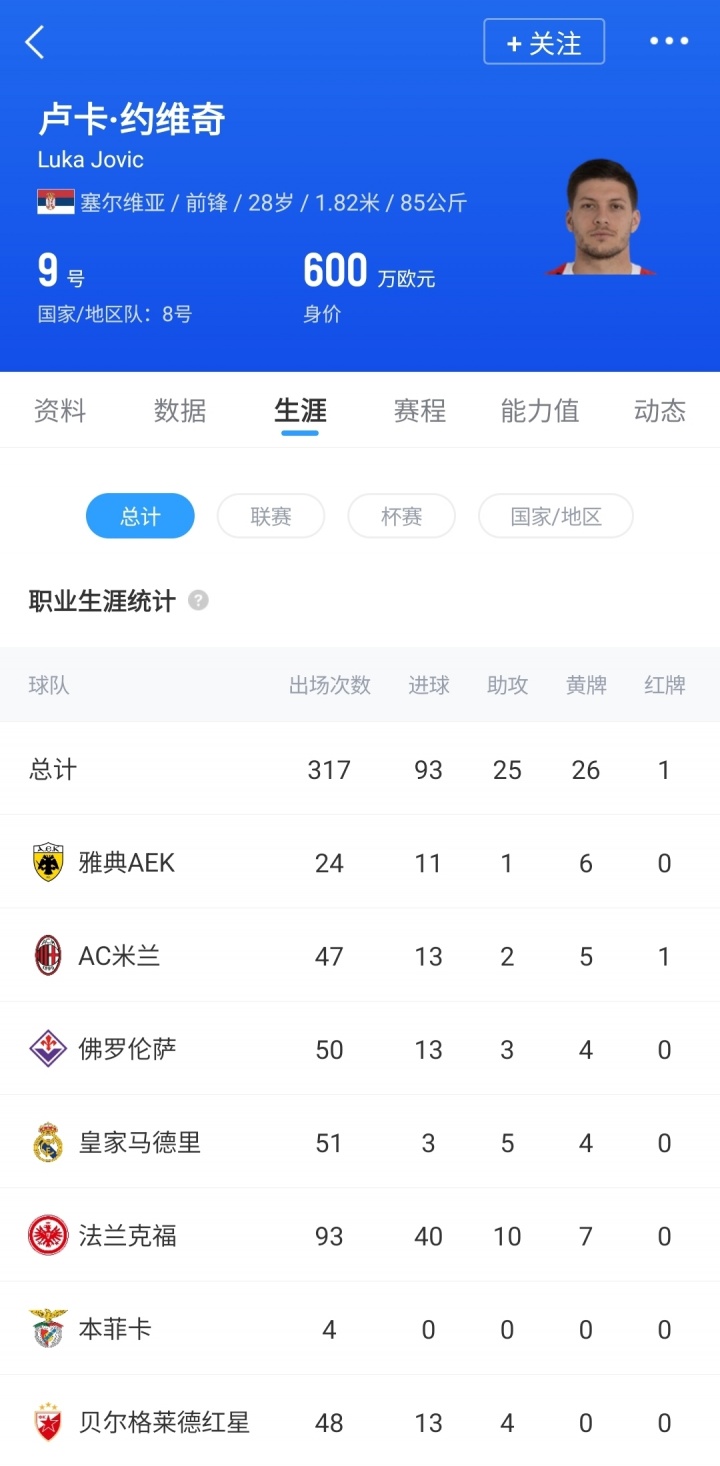上赛季约维奇与AC米兰合同到期后离队,加盟雅典AEK,本赛季共出战24场比赛,贡献11球1助,德转身价600万欧,为巅峰6000万欧的十分之一。