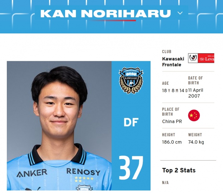 这名球员名为关德晴(Kan Noriharu),身高186cm,体重74kg,司职左后卫。川崎前锋官网资料显示,球员出生于日本东京八王子市,此前是球队的青训球员,赛季结束后进入一线队名单。