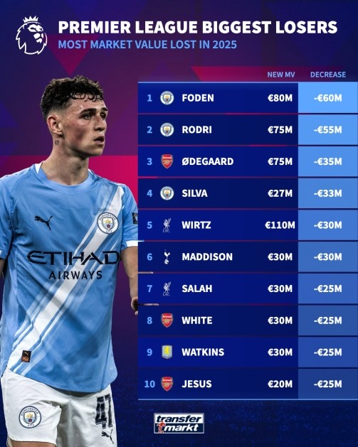 12月25日讯 德国转会市场公布了新一期的球员身价情况,进入2025年后,英超多名球星身价出现大幅下跌。德国转会市场盘点了2025年英超球员身价下跌榜,曼城两将福登和罗德里分别下跌6000万欧元和5500万欧元位居前二。