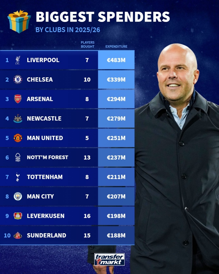 12月26日讯 德转统计了本赛季俱乐部引援花费排行,利物浦4.83亿欧领跑,前十英超球队占9席。