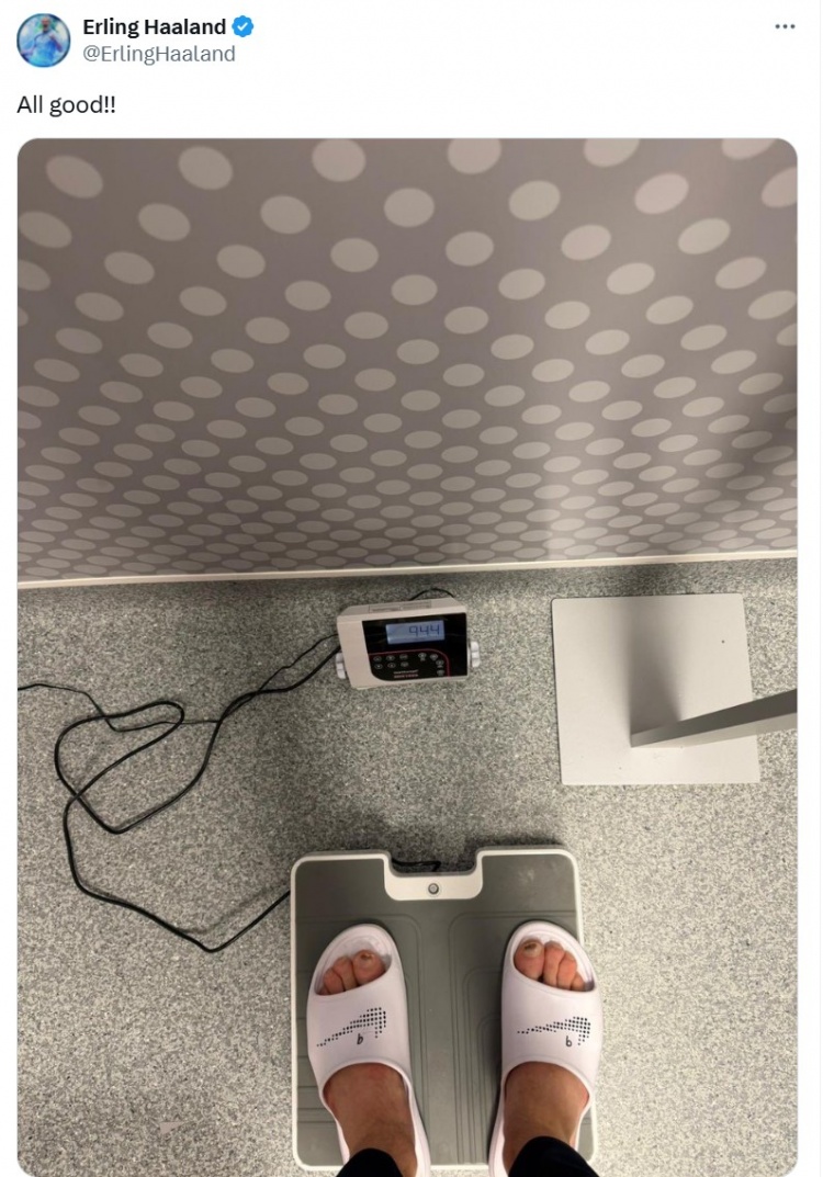 对于瓜迪奥拉的安排,曼城当家射手哈兰德显然牢记在心。在社交媒体上,哈兰德晒出了自己称体重的图片,并写道:一切都好。