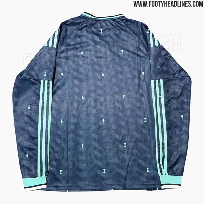 媒体晒出2026年世界杯德国队长袖版客场球衣谍照,这款球衣由阿迪达斯设计,主色调为深海军蓝,领口、袖口、三道杠则为薄荷绿。
