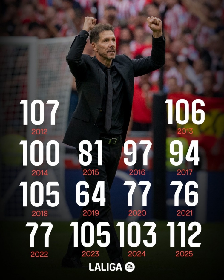 12月26日讯 西甲官方晒出西蒙尼执教以来马竞历年的进球数量,并列出榜单,今年打进112球最多。