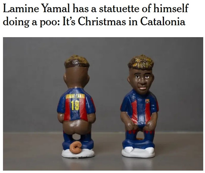 有些人可能会对这种卡通形象感到冒犯,但亚马尔并不觉得。每次阿洛斯的团队制作出新的巴萨球员排便小人,他们都会尝试亲手送给球员们,就像最近对库巴西那样,而库巴西和亚马尔一样,都是本地孩子。