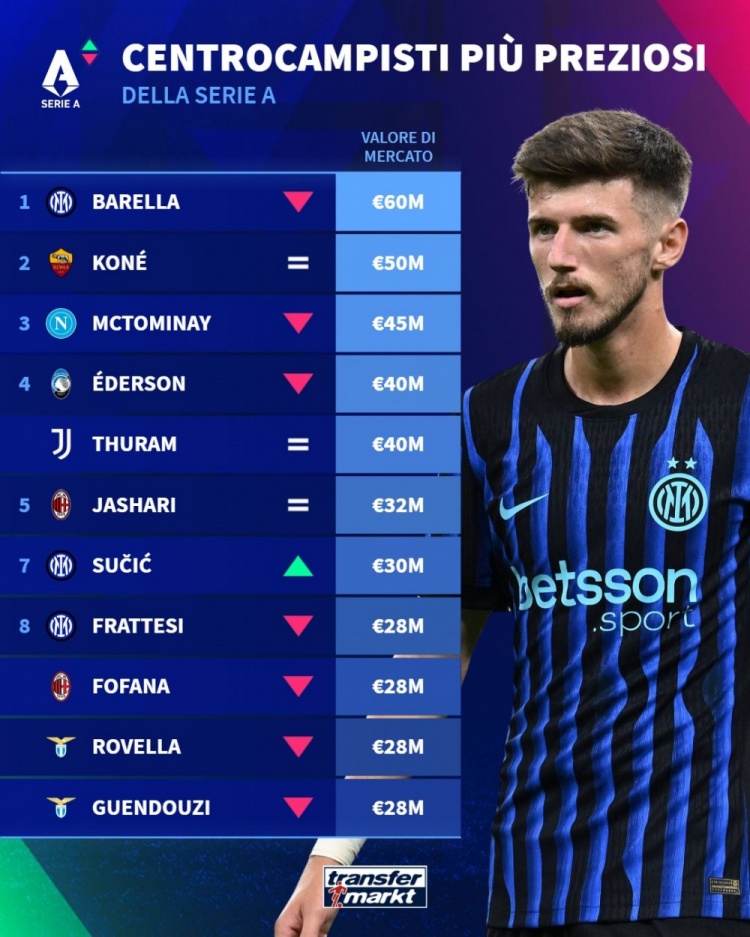 意甲中场中路球员身价榜:巴雷拉6000万欧居首,科内、小麦前三