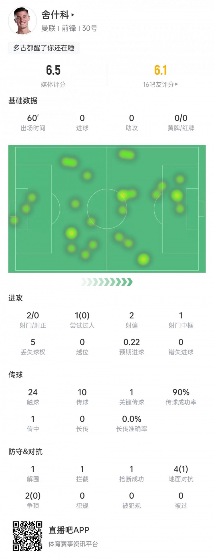 舍什科本场数据:2次射门1次中框,6次对抗1次成功,获评6.5分