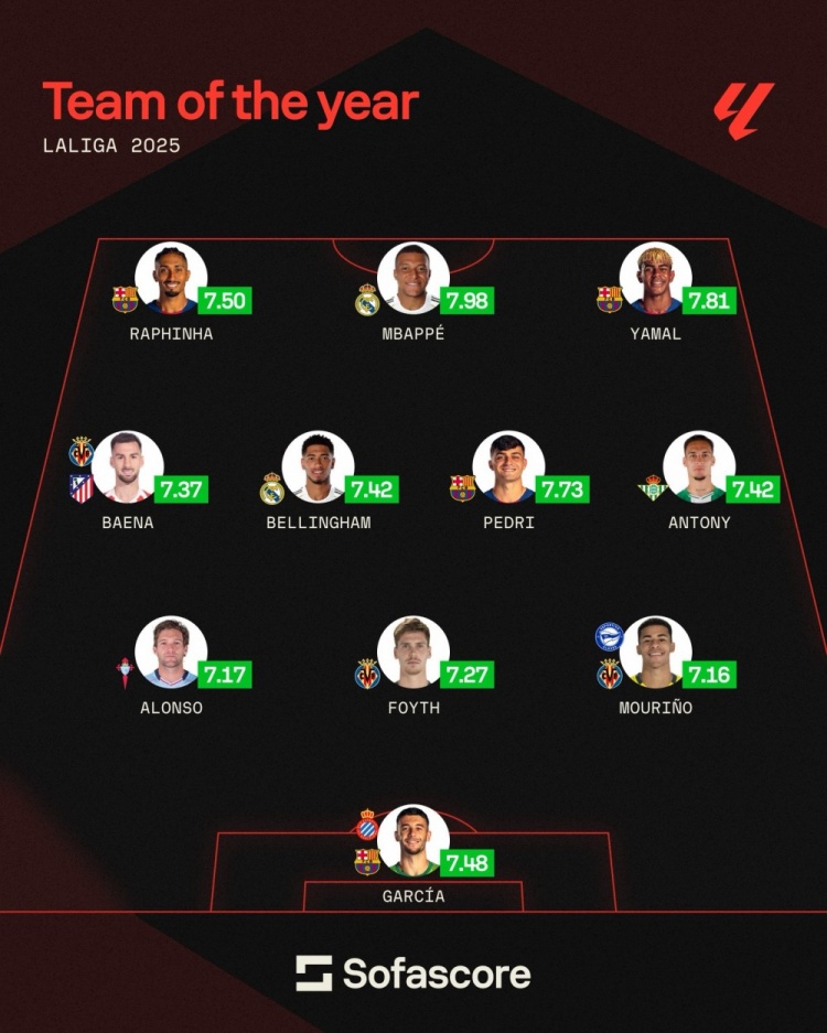 12月27日讯 Sofascore评出了2025年西甲最佳阵容,姆巴佩、拉菲尼亚、亚马尔组成三叉戟。