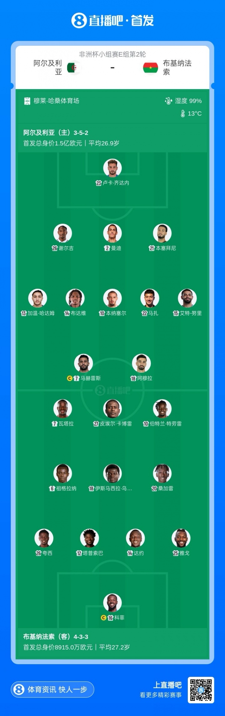 12月29日讯 非洲杯小组赛E组第2轮,阿尔及利亚主场迎战布基纳法索,赛前双方首发公布。