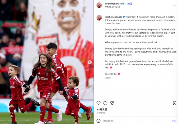 “迪奥戈,我知道我们再也无法和你一起踏上足球场了,我的兄弟。但昨天的感觉就像我们又在一起并肩作战一般。你的一部分与我们同在,赛前就陪伴在我们身边。”